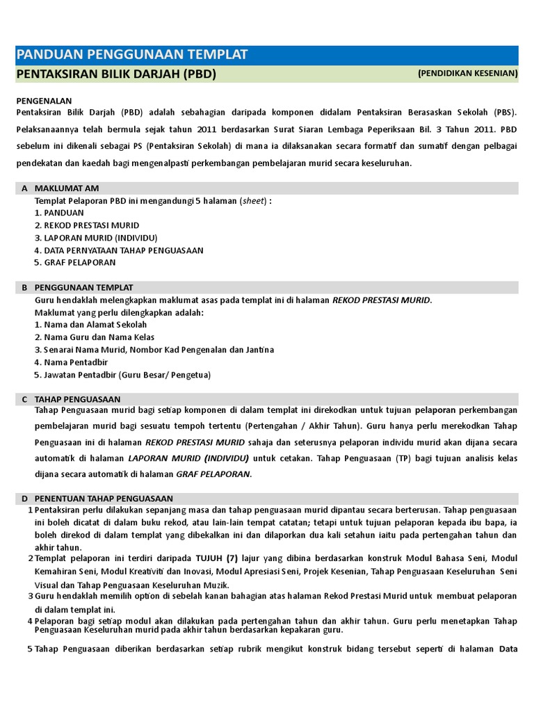 SAINS Kertas 2 Tahun 3 Oktober 2019 1 jam PENTAKSIRAN BILIK DARJAH PBD AKHIR TAHUN 2019. V KANDUNGAN KATA PENGANTAR v. Himpunan Templat Pelaporan PBD Tahun 1 adalah sebahagian daripada komponen di dalam Pentaksiran Berasaskan Sekolah PBS Tahun 1.